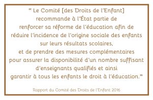 Selon un rapport de l’UNICEF de 2015, après les enfants en situation de handicap, « les enfants les plus discriminés en matière d’accès à l’éducation en France sont certainement les enfants vivant en bidonvilles ». L’organisme estime entre 20% et 50% le taux d’enfants *déscolarisés dans ces milieux.